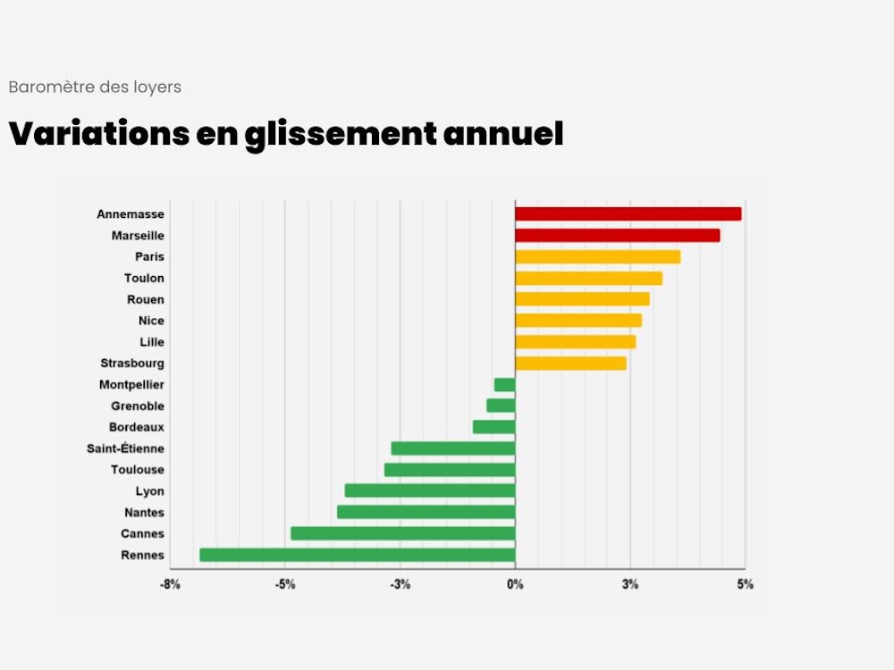Ce mois-ci, on observe de fortes variations sur les loyers dans les grandes agglomérations de France avec deux villes qui enregistrent une hausse supérieure à 4 % avec Annemasse (+ 4,9 %) et Marseille (+ 4,5 %). Neuf villes enregistrent une déflation en Février 2026 en commençant par Montpellier (- 0,5 %) et finissant par Rennes ( – 6,9 %)