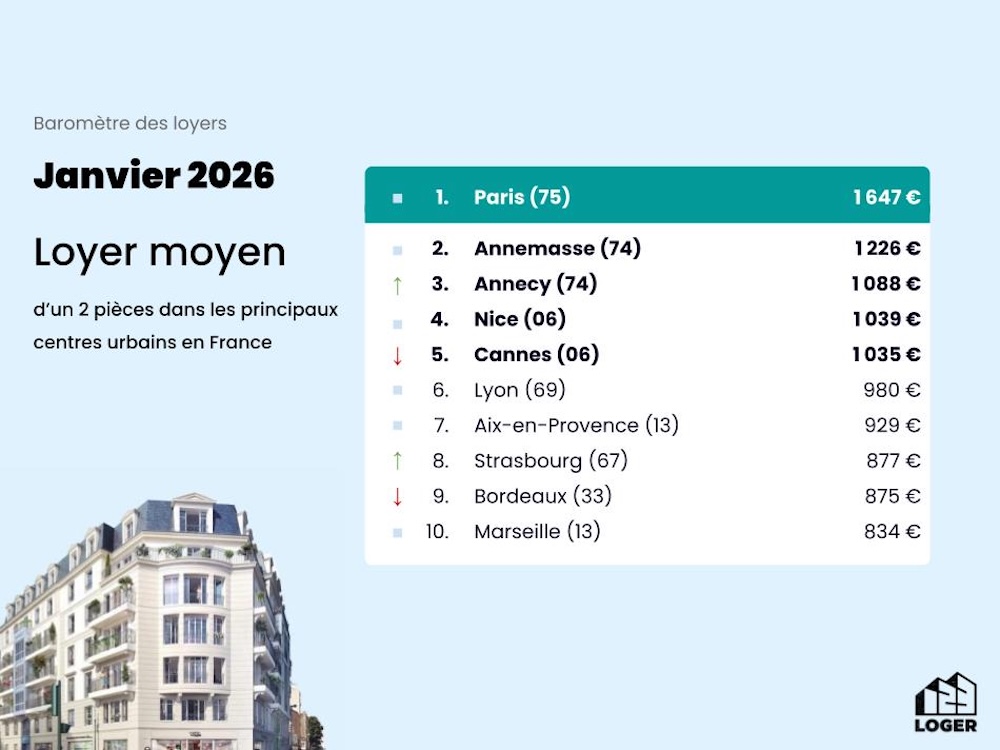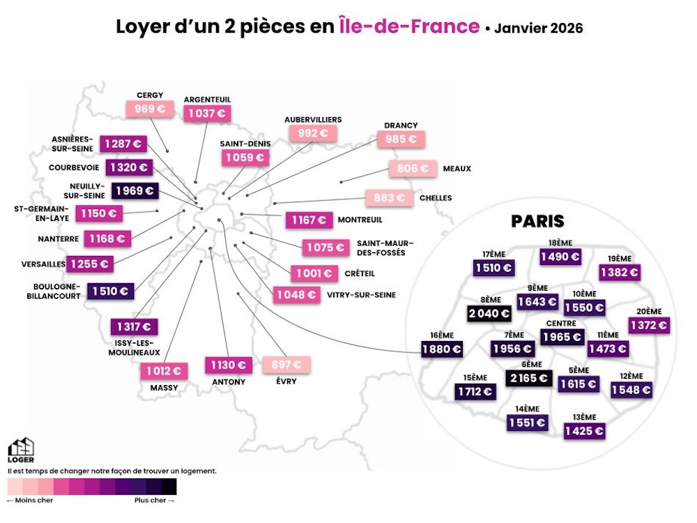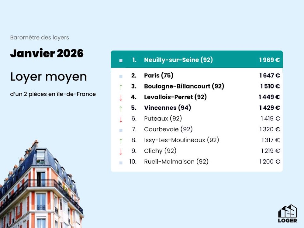 - En ce début d’année 2026, Paris perd sa première place de la ville la plus chère où se loger en Ile-de-France avec un loyer moyen qui dépasse les 1 600 € derrière Neuilly-sur-Seine et ses 1 967 euros de loyer moyen pour un 2 pièces.