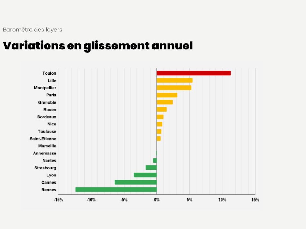 Ce mois-ci, on observe de fortes variations sur les loyers dans les grandes villes de France avec une ville qui enregistre une hausse à deux chiffres avec Toulon et ses +11,3 %. Ce mois-ci 5 villes sont en déflation allant de Annemasse ( -0,1 %) à Rennes ( -12,4 %)