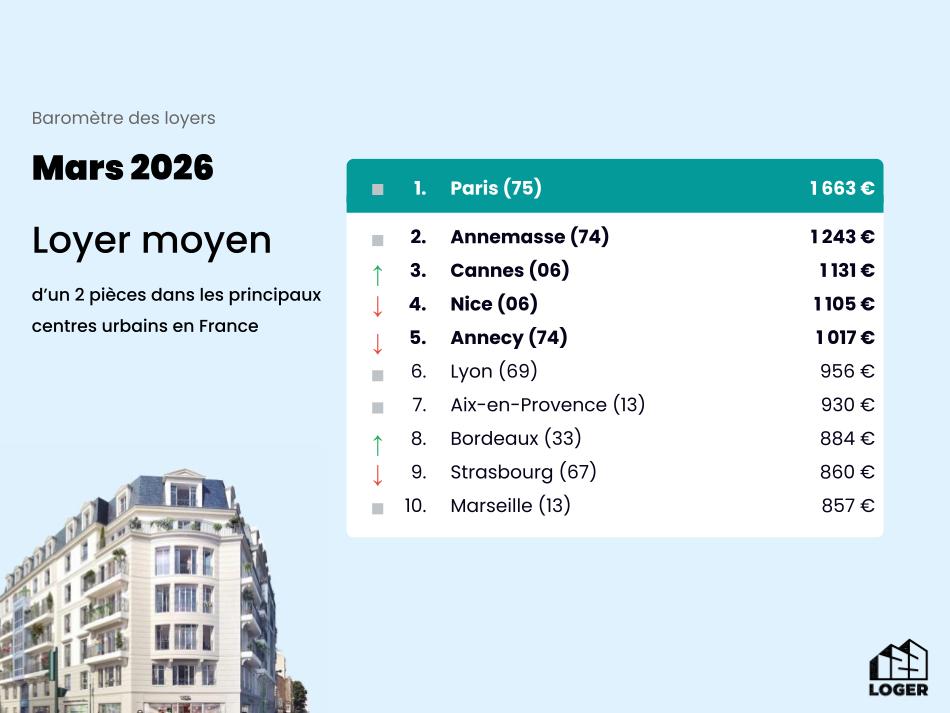 Le podium des villes les plus chères où se loger en Mars 2026 connait quelques changements mineurs par rapport à Février 2026. Nous retrouvons donc Paris devant Annemasse et Cannes devant Nice ce mois-ci. Annecy est à la cinquième place des villes où le loyer moyen est supérieur à 1 000 € pour un 2 pièces.