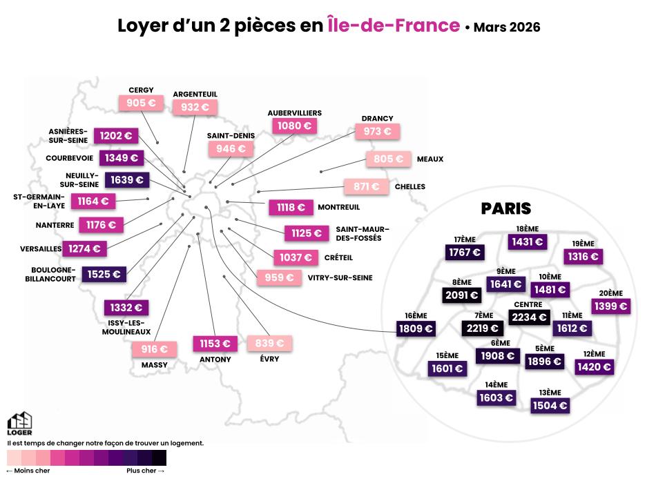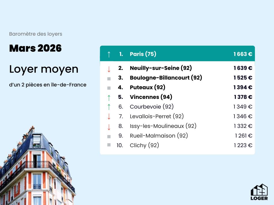 - Pour la première fois de l’année 2026, Paris se hisse à la première place de la ville la plus chère où se loger en Ile-de-France avec un loyer moyen de 1 663 € devant Neuilly-sur-Seine et ses 1 639 euros de loyer moyen pour un 2 pièces.