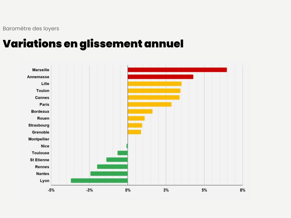 Ce mois-ci, on observe de fortes variations sur les loyers dans les grandes agglomérations de France avec Marseille (+ 6,4%) qui devance Annemasse (+ 4,3 %) et Marseille (+ 4,5 %). Six villes enregistrent une déflation en Mars 2026 en commençant par Nice (- 0,1 %) et finissant par Lyon ( – 3,7 %)