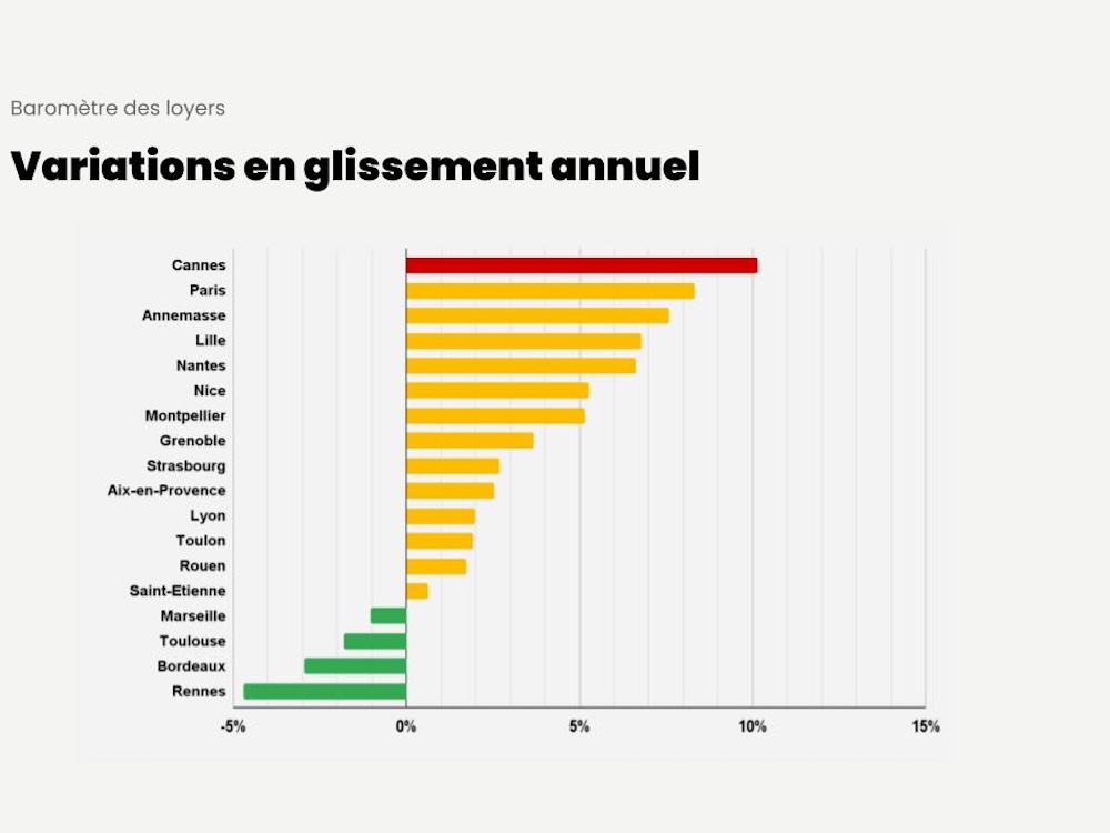 Ce mois-ci, on observe de fortes variations sur les loyers dans les grandes villes de France avec Cannes qui enregistre une hausse à deux chiffres; +10,1 %. Paris occupe la deuxième place avec +8,3 % de variation annuelle. Quatre villes enregistrent une déflation en Octobre 2025 représenté par Marseille (-1 %), Toulouse (-1,8 %), Bordeaux (-2,9 %) et Rennes (-4,7 %)