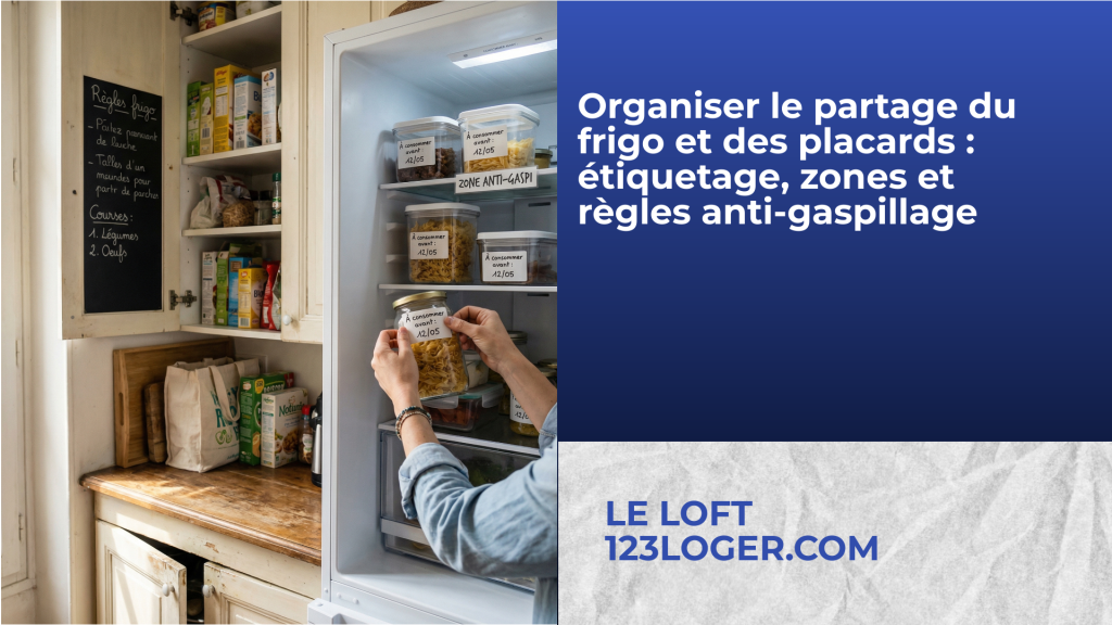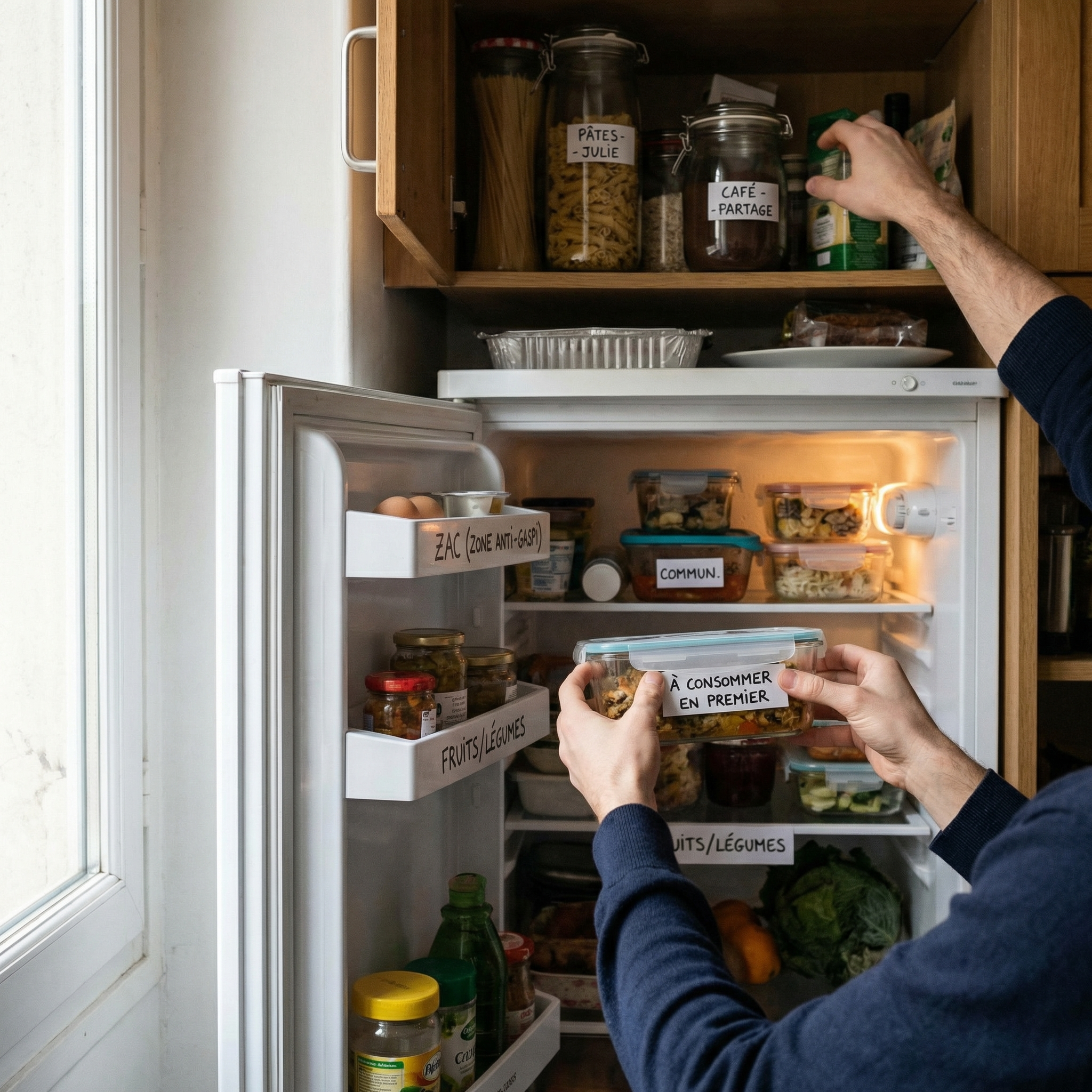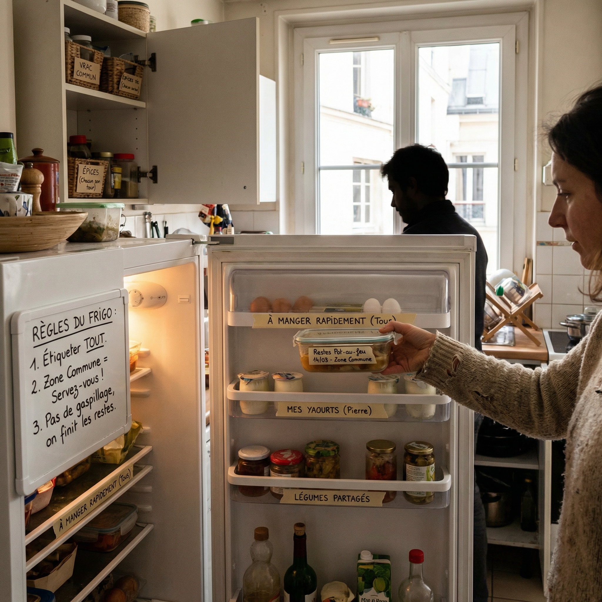 En résumé : l’article propose une méthode simple pour éviter les tensions en colocation en clarifiant le partage (règles, zones, étiquettes), en organisant frigo/placards, et en instaurant des routines de ménage et d’anti-gaspillage.